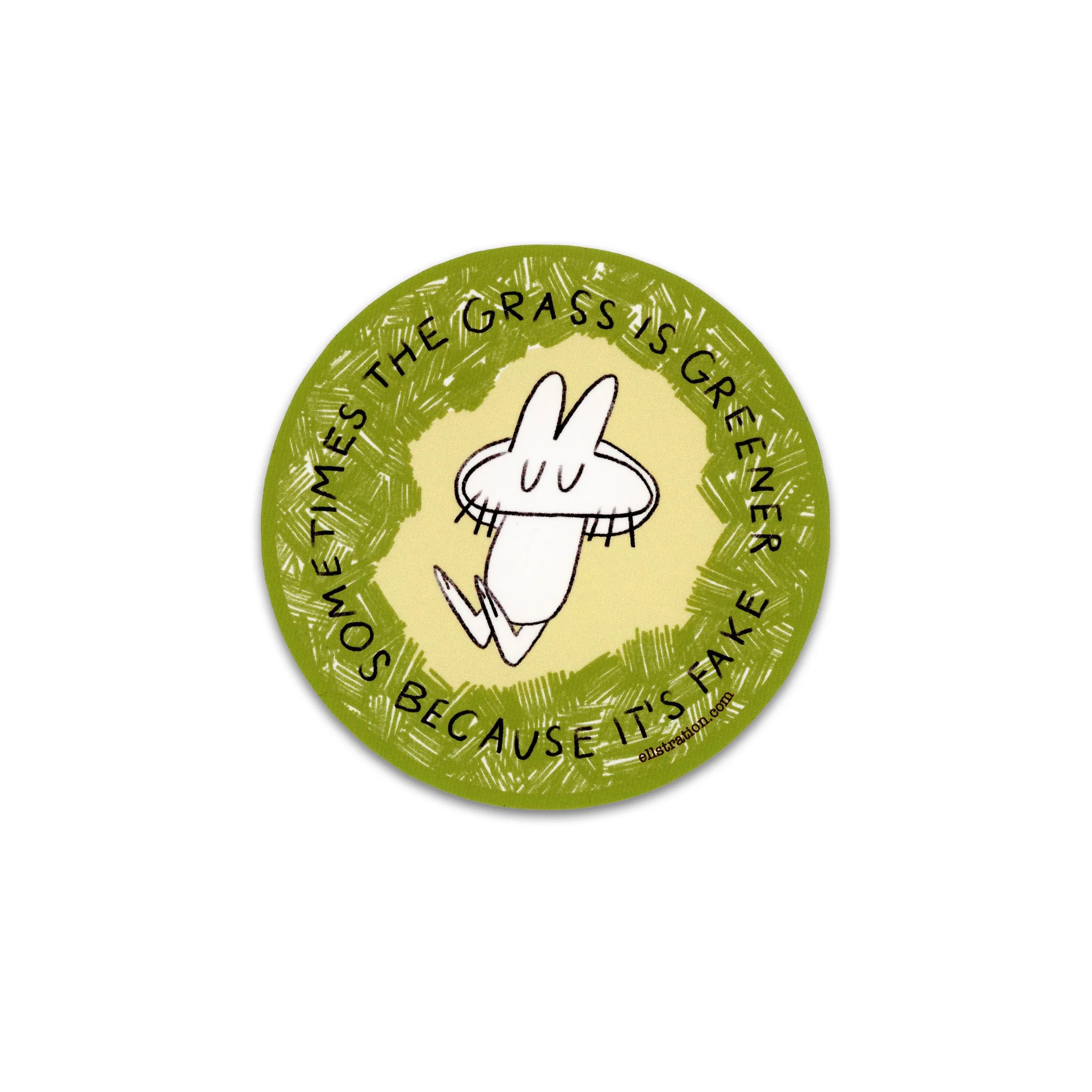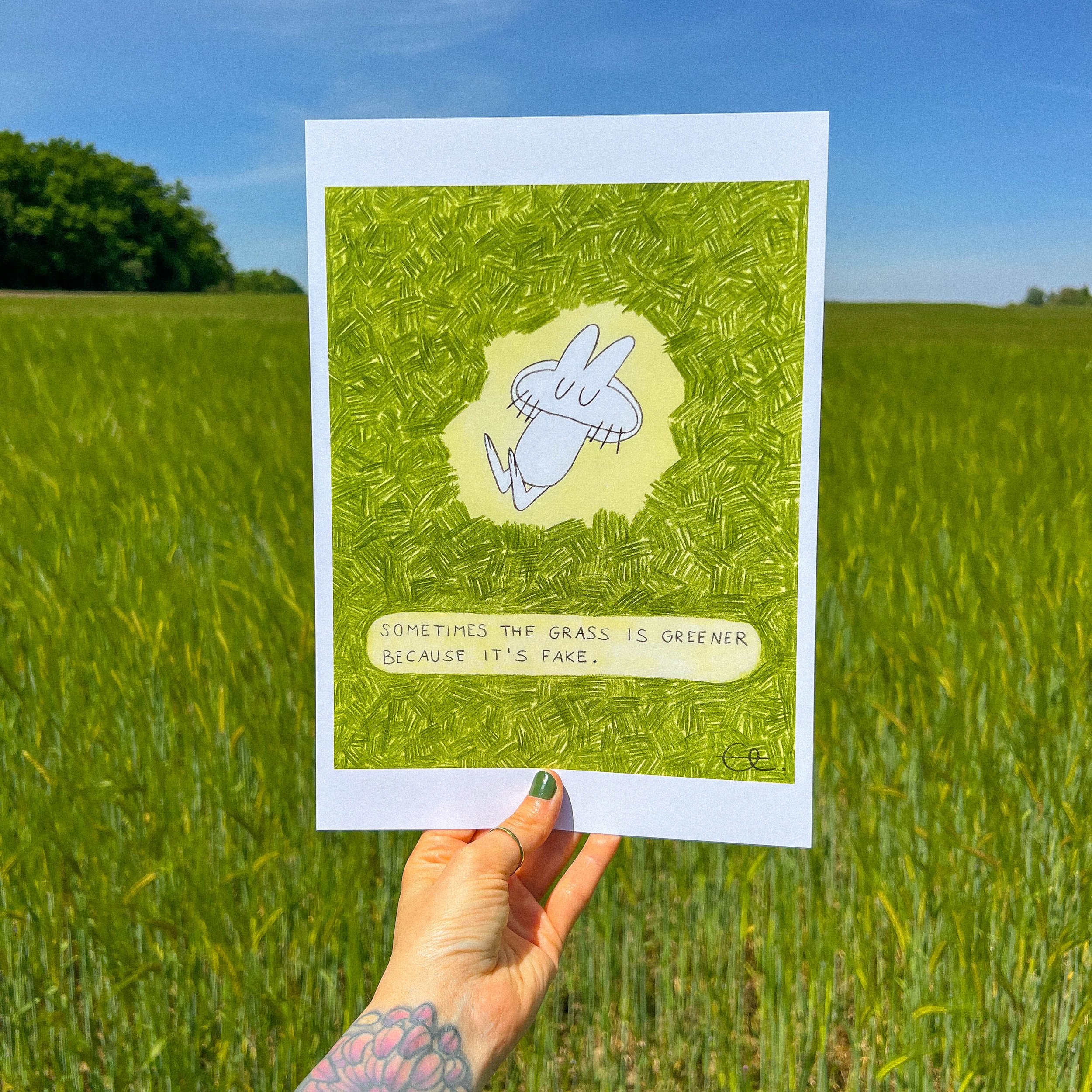 The Whisper of the Grass is a poetic art print that gently shifts perspective. It features a white rabbit resting peacefully on a patch of imperfect real grass, surrounded by a lush green artificial meadow. Placed within the meadow, the words “Sometimes the grass is greener, because it’s fake“ hint that happiness isn’t missing just waiting to be noticed.